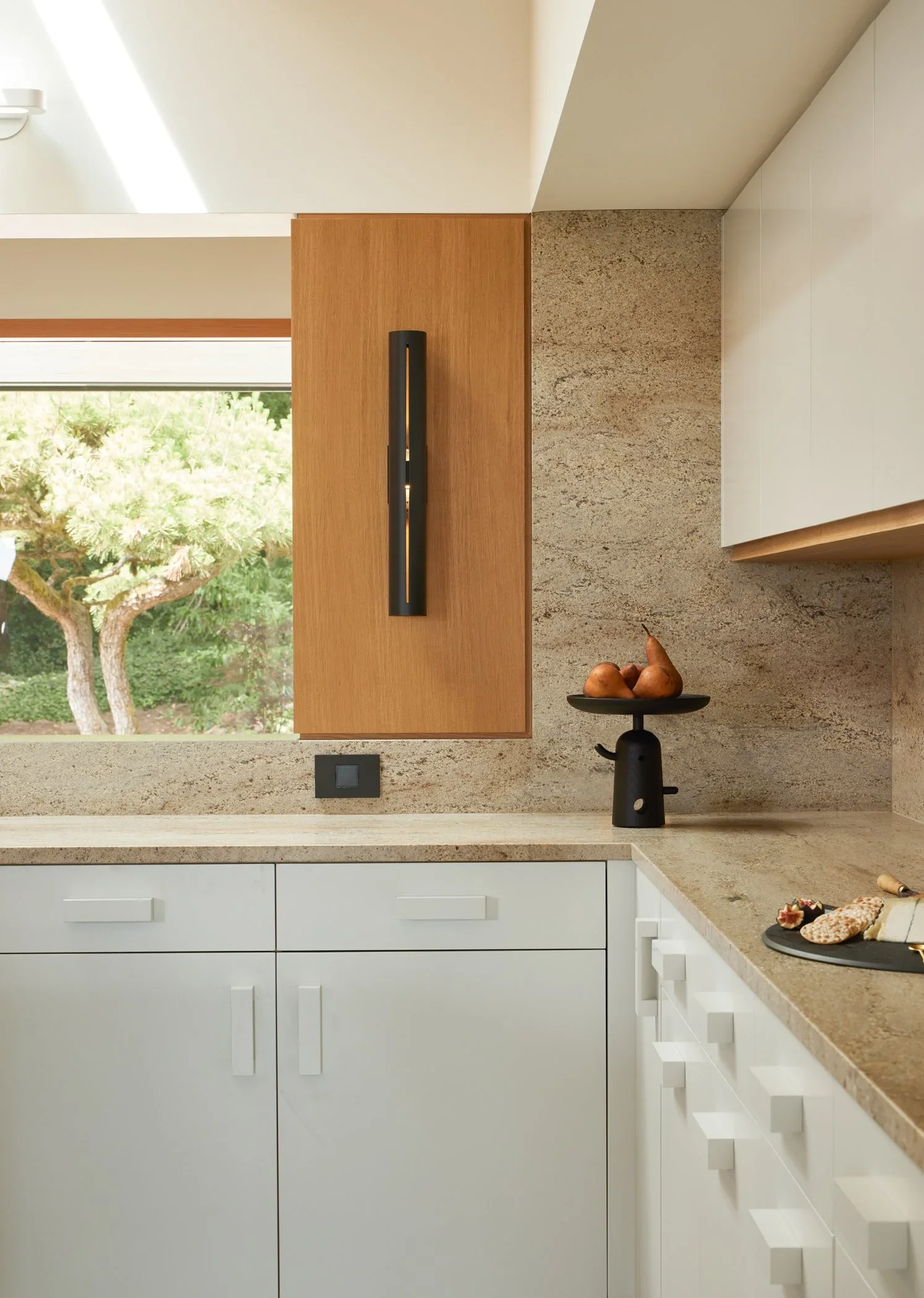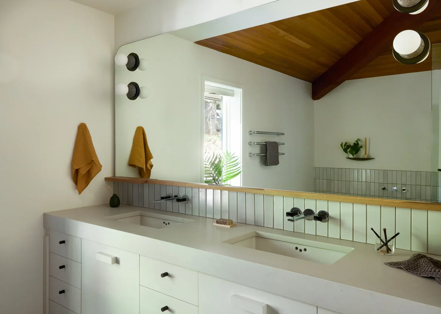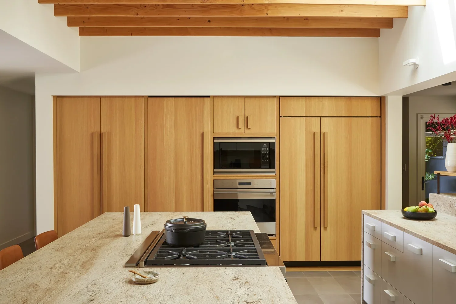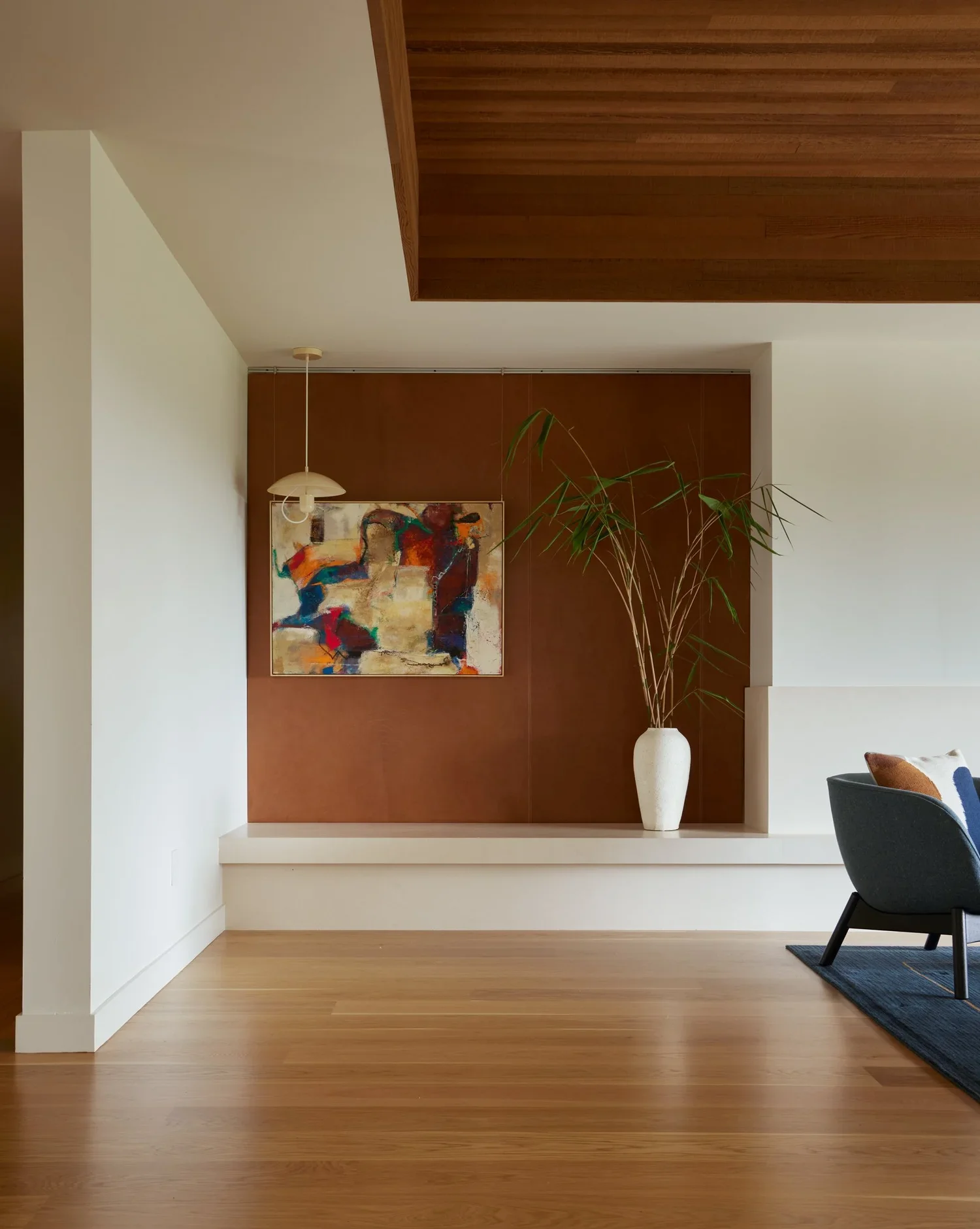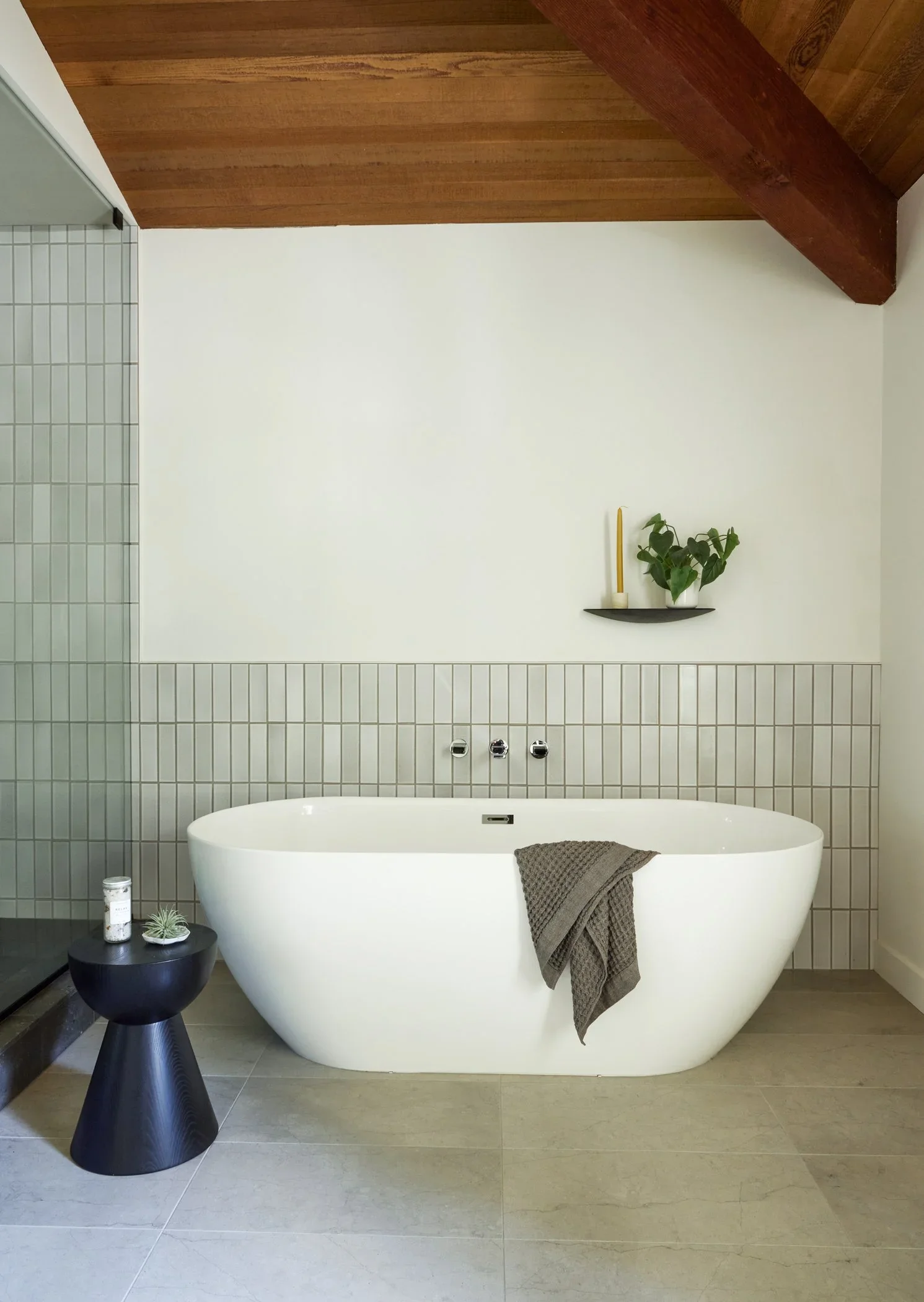 Throughout the home, we applied a palette of muted, natural tones and materials chosen for their ability to evoke a modern yet organic sensibility. The result is a space that feels warm, serene, and deeply livable. In the living room, original wood plank ceilings were preserved and thoughtfully integrated into the new design, bridging the home’s architectural past with its contemporary future.
