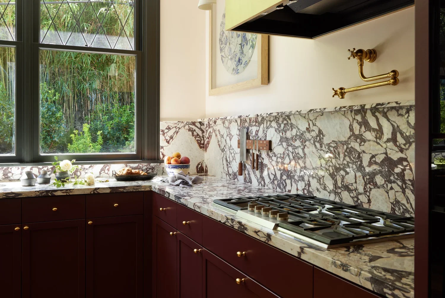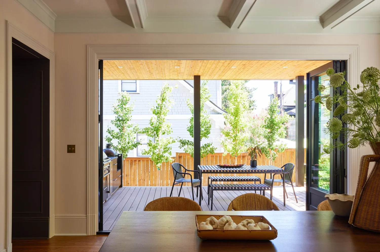 By strategically extending the kitchen just six feet in two directions, we unlocked the potential for a dream kitchen design: generous Calacatta Viola countertops, a spacious central island, and an entire wall of doors that fold open to the outdoor entertaining space, seamlessly blending indoor and outdoor living.